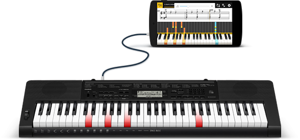 Az okos eszközt audio kábel segítségével csatlakoztathatja* a hangszerhez** a zene és akkordnevek*** az audio jellel együtt elküldhetők. A háttérvilágítással ellátott billentyűzetek esetén a lejátszott hangoknak megfelelő gombok fognak világítani a különböző MIDI fájlok lejátszásakor, ezzel is hozzájárulva a kiválasztott dal tökéletes kivitelezéséhez.**** Ezenkívül a különböző műsorszámok adatait el is tudja tárolni egyes modellekben, így lehetővé téve az oktatóanyagok végrehajtását csak a készülék billentyűzetén.