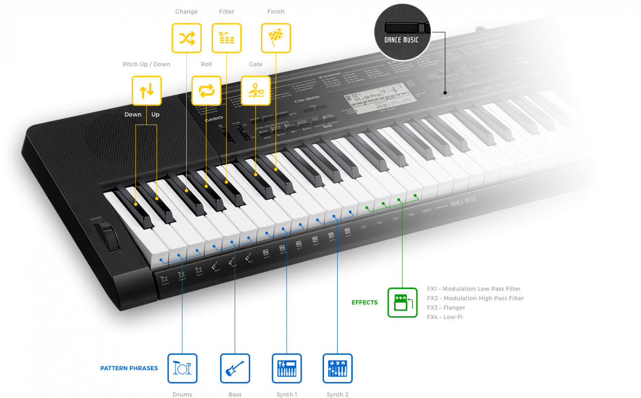 Az új Dance Music Mode segítségével az egyes gombokat különféle hangszerekre állíthatja be – dobokra, basszusra, szintetizátorokra stb. A különböző billentyűkombinációk lejátszásával könnyedén és szórakoztatóan hozhat létre zenéket vagy akár lehetősége van mixelésre.